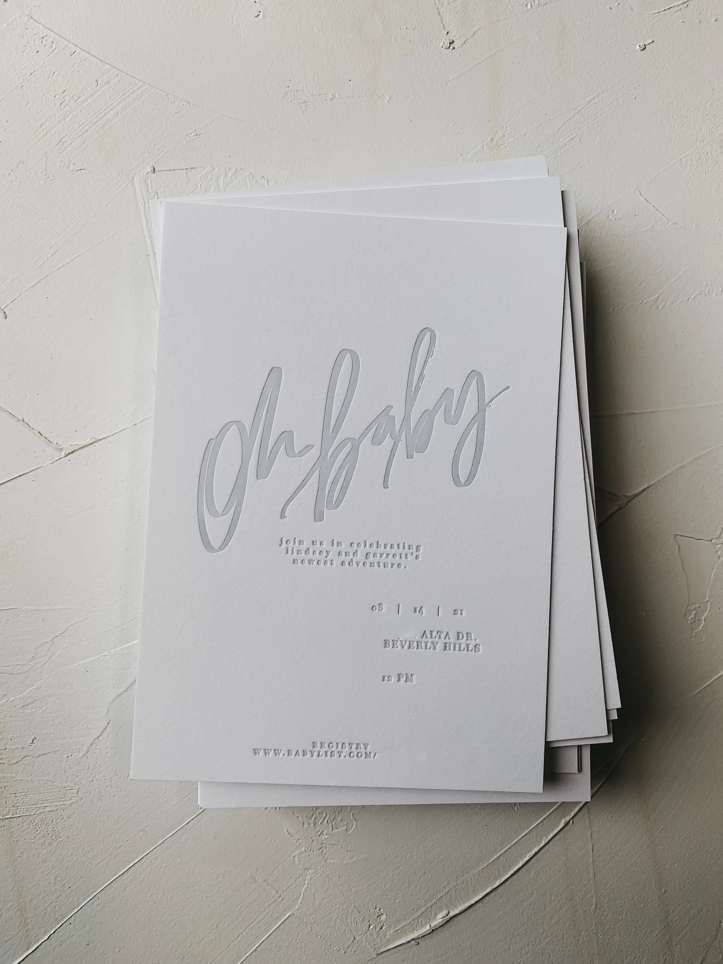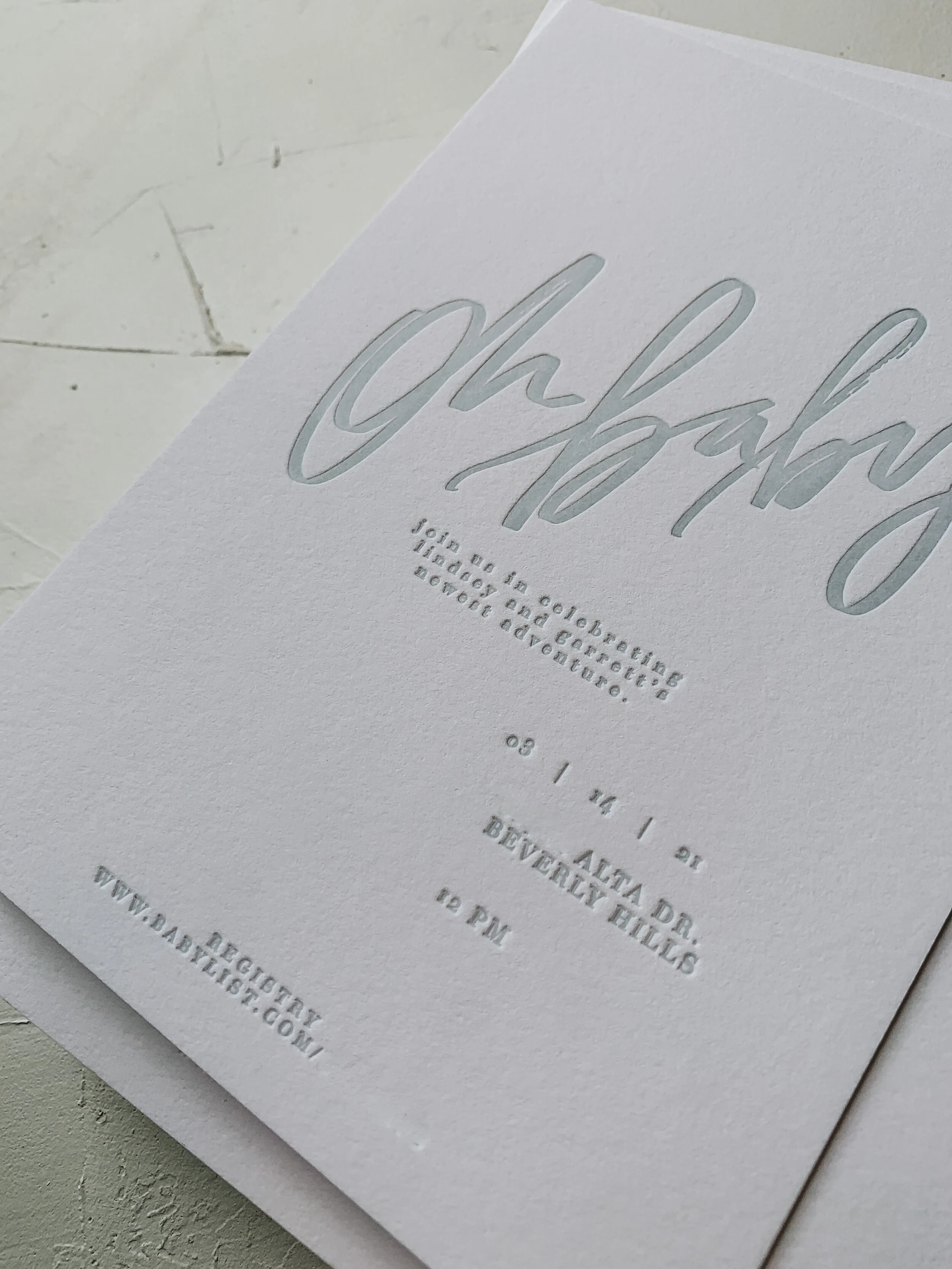 These sweet baby shower invites are printed in a soft, dusty blue. Printed on 220# paper to achieve a nice, deep impression. These invites paired well with a dusty blue envelope!