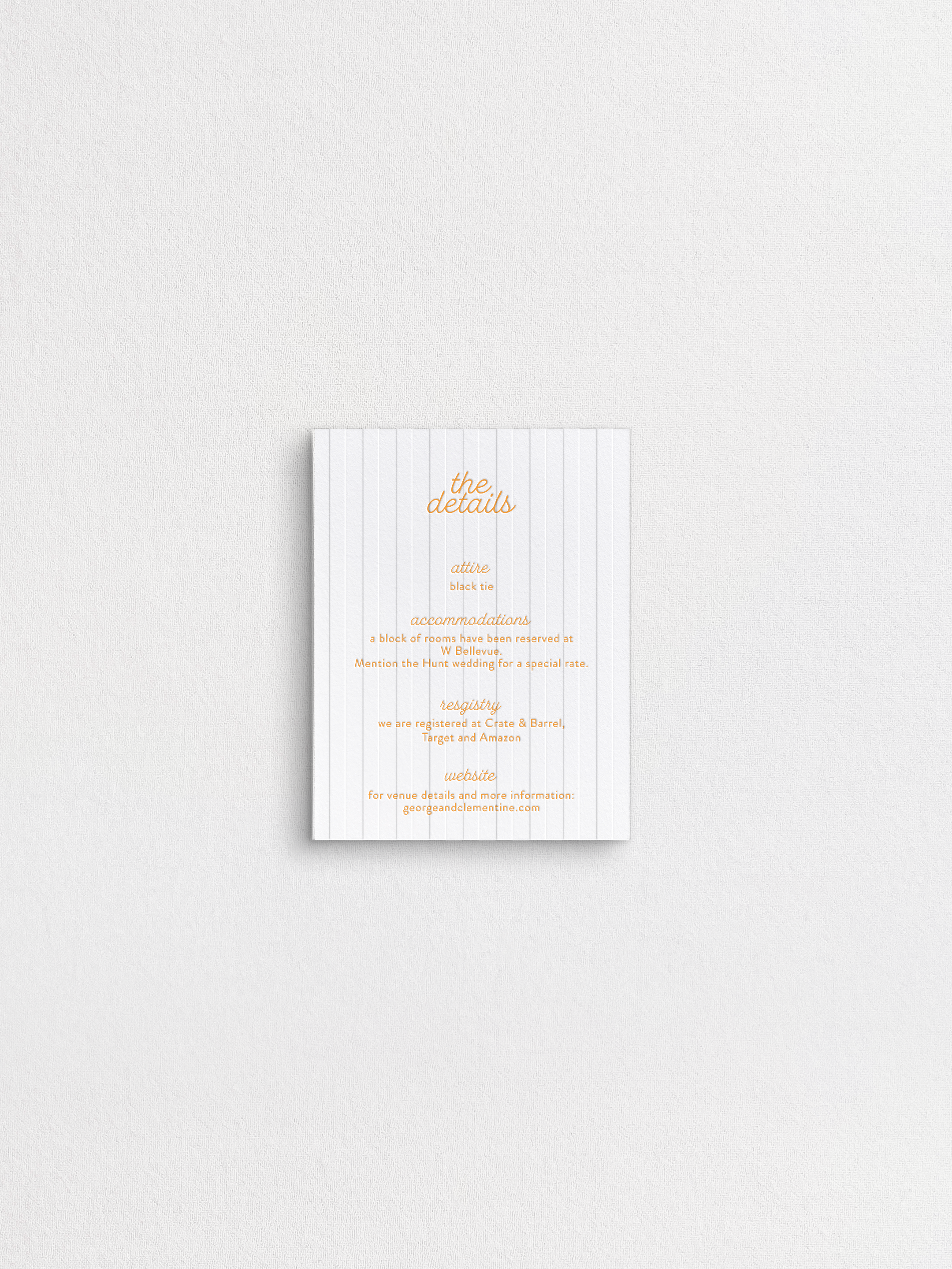 The Clementine suite showcases a bouncy cursive font that adds a playful yet elegant touch to your celebration. Featuring a sophisticated stripe blind emboss, the design brings texture and depth without overpowering the overall look. Paired well with vibrant, rich colors, this suite truly stands out, creating a joyful and memorable first impression for your guests.