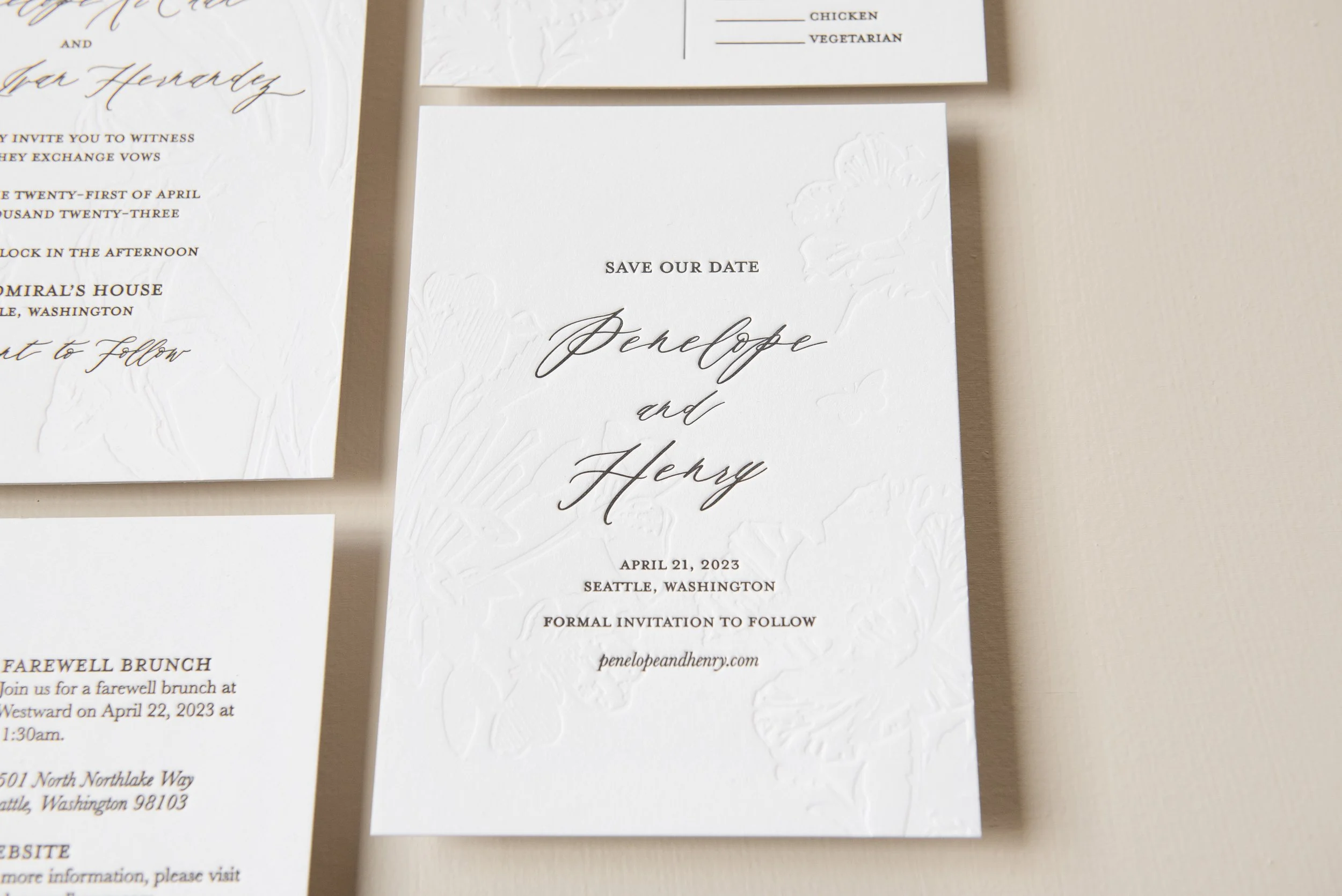 The Nouvelle Vie (translates to ‘new life’ in French) was inspired by the start of spring and celebrates the idea of new beginnings. This suite features blind embossing, made up of a lush garden backdrop with an elegant typography overlay. Its details are upscale yet approachable and leans heavily on the theme of nature, ensuring a design that will stand the test of time for years to come.