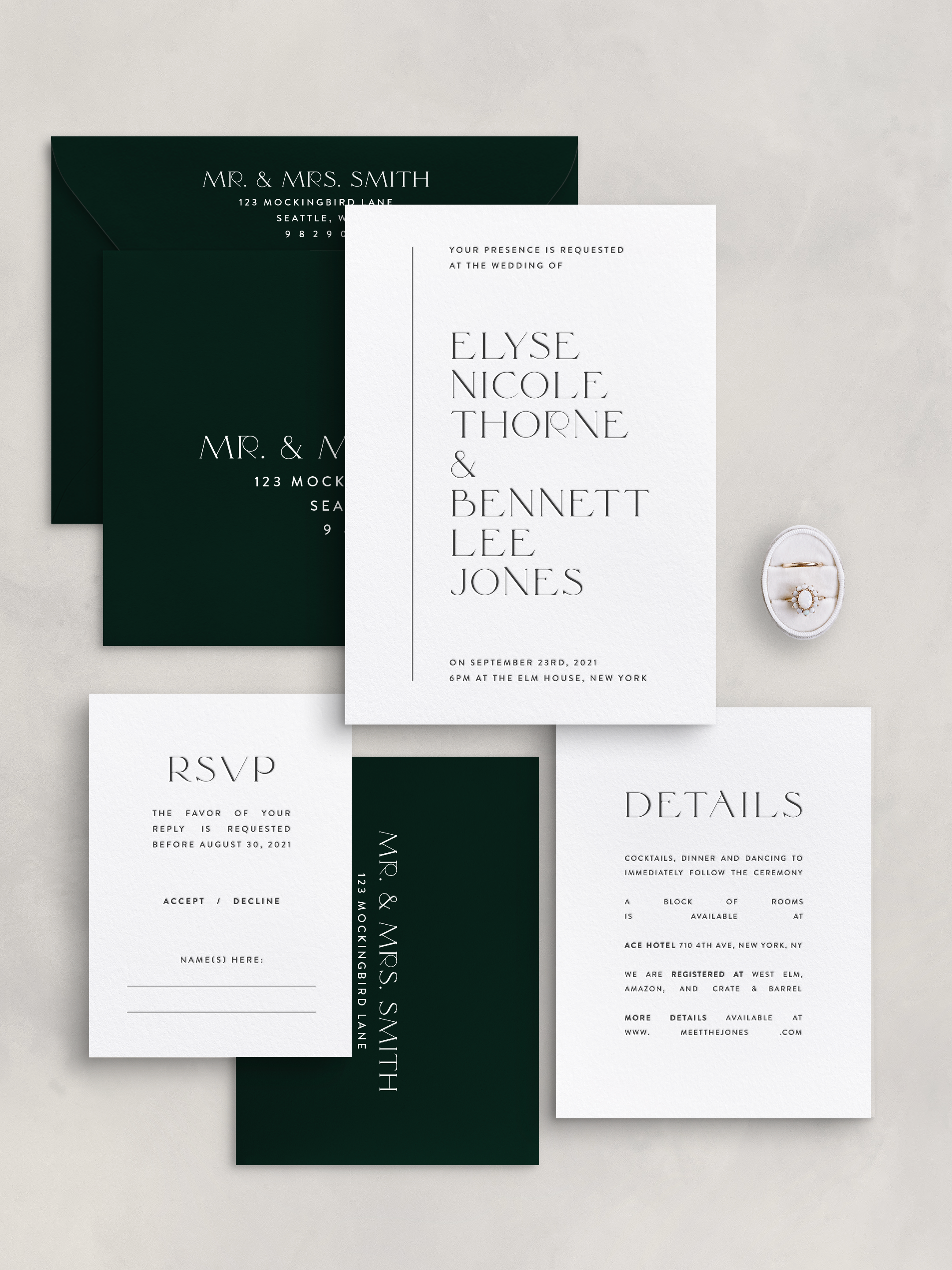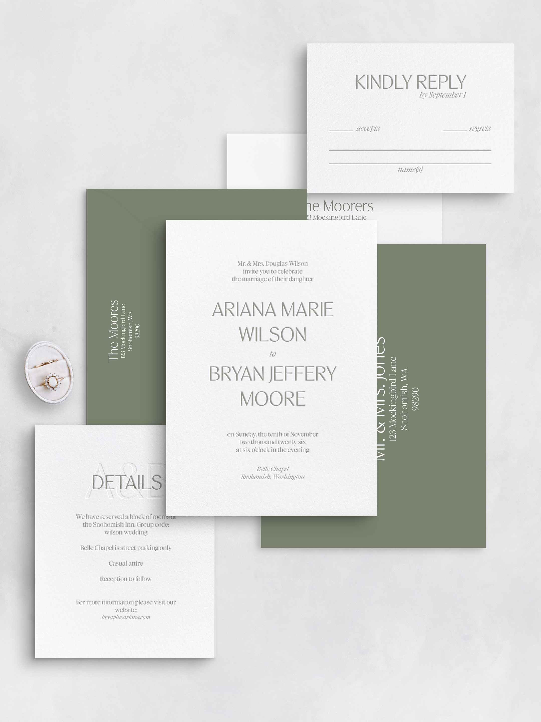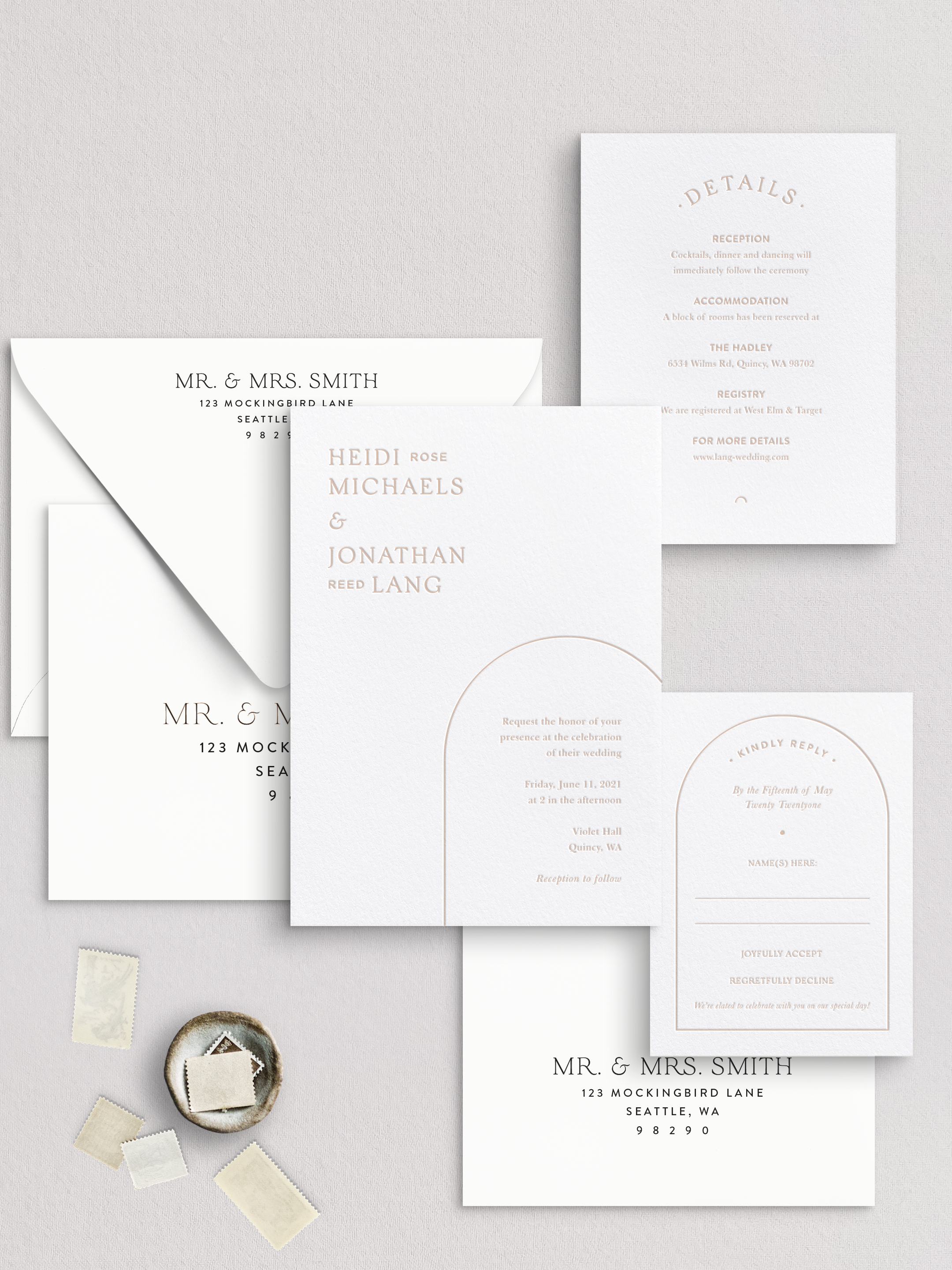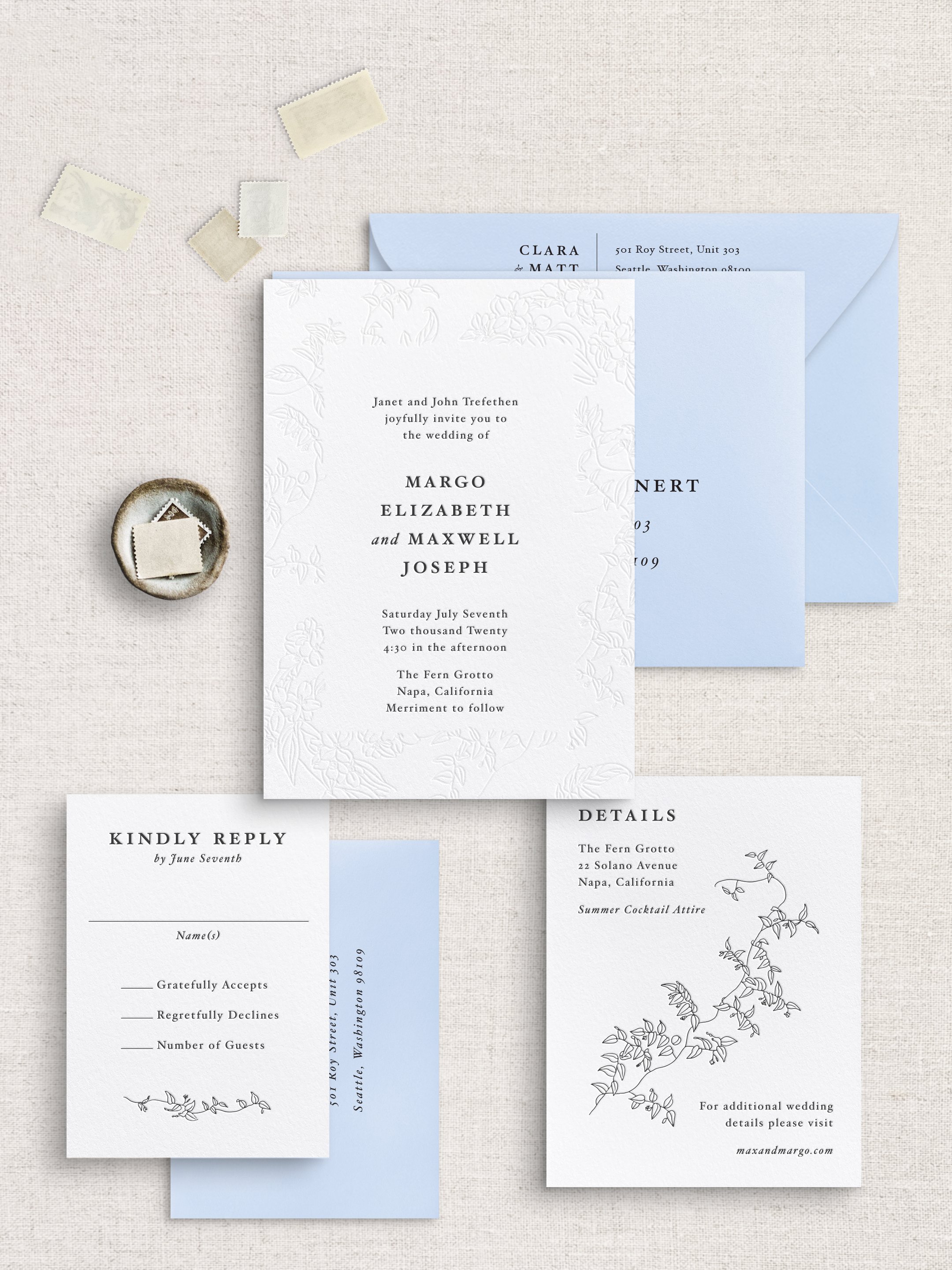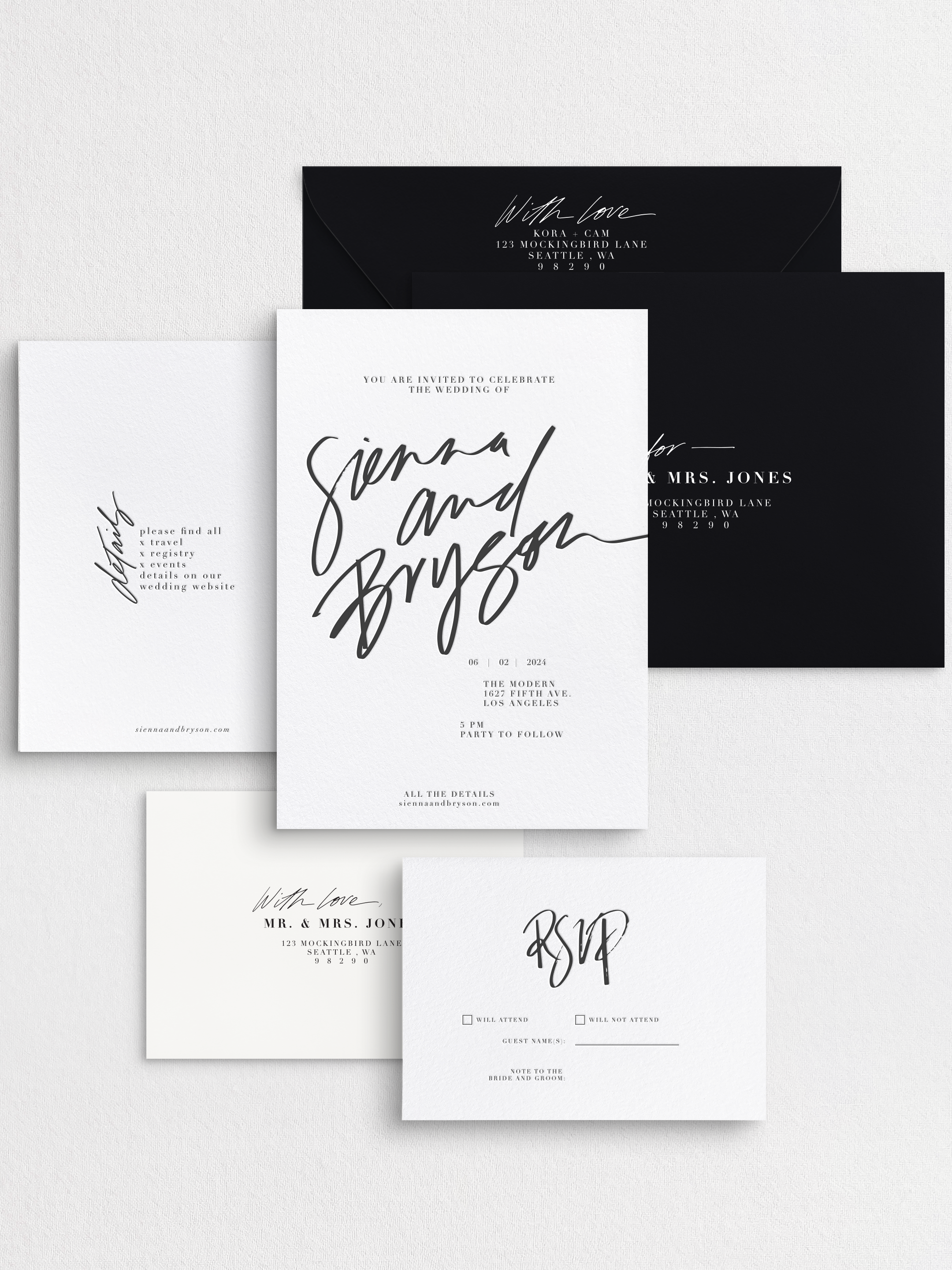 Inky collaborates with talented designers to craft luxury wedding suites, each paired with a carefully curated palette of ink colors and finishing options, all ready for your personal touch. Simply choose the style that speaks to you, select the pieces you'll need, and pick the colors that suit your vision. Explore the process and browse the collection below to begin your journey toward beautifully customized invitations!